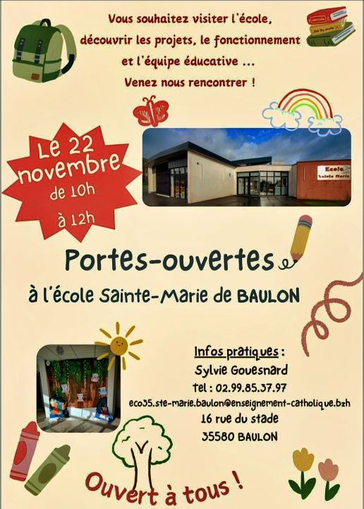 Vous avez envie de découvrir l'école, d'en apprendre plus sur son fonctionnement, ou encore de rencontrer l'équipe éducative, venez à nos portes-ouvertes le Samedi 22 novembre, de 10h à 12h. Nous serons ravis de vous accueillir !